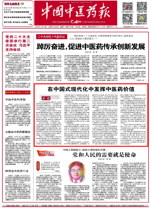 傳承創新發展中醫藥是新時代中國特色社會主義事業的重要內容,是中華民族偉大復興的大事。新的歷史方位下,吾輩中醫藥人更當堅定信心、埋頭苦干、奮勇前行,在以習近平同志為核心的黨中央堅強領導下,為全面建設社會主義現代化國家、全面推進中華民族偉大復興而團結奮斗!