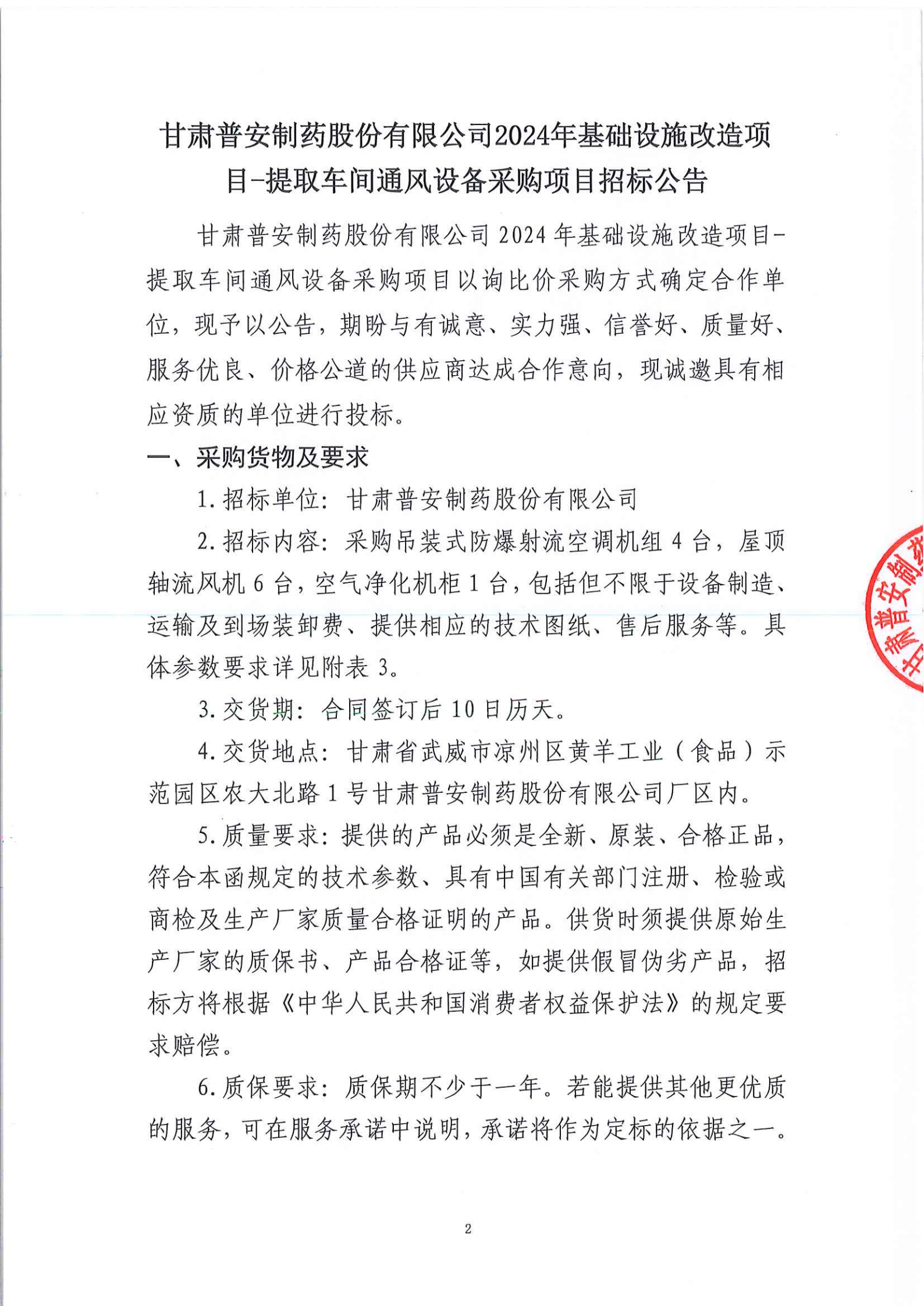 甘肅普安制藥股份有限公司2024年基礎設施改造項目-提取車間通風設備采購項目招標公告