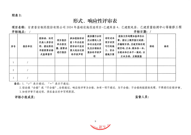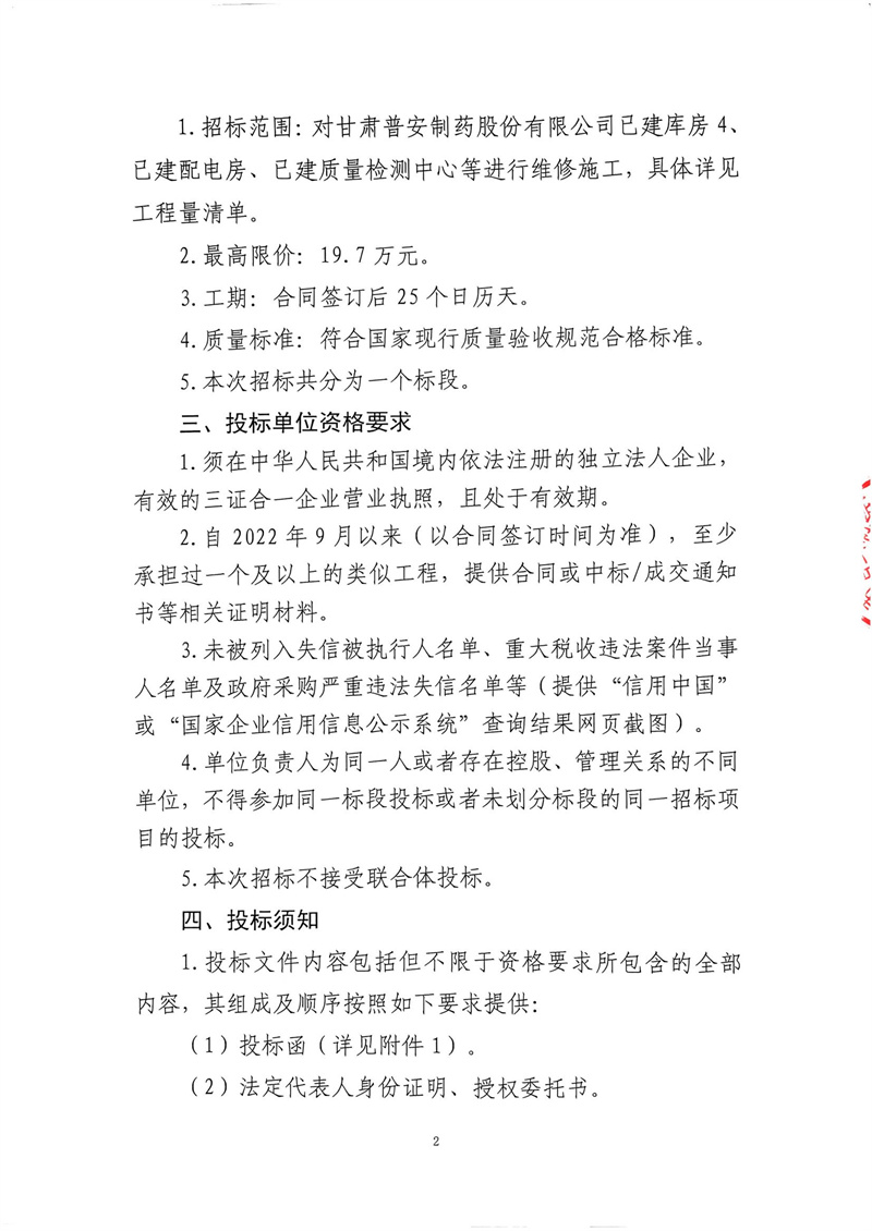 甘肅普安制藥股份有限公司2024年基礎設施改造項目-已建庫房4、已建配電房、已建質量檢測中心等維修工程招標公告