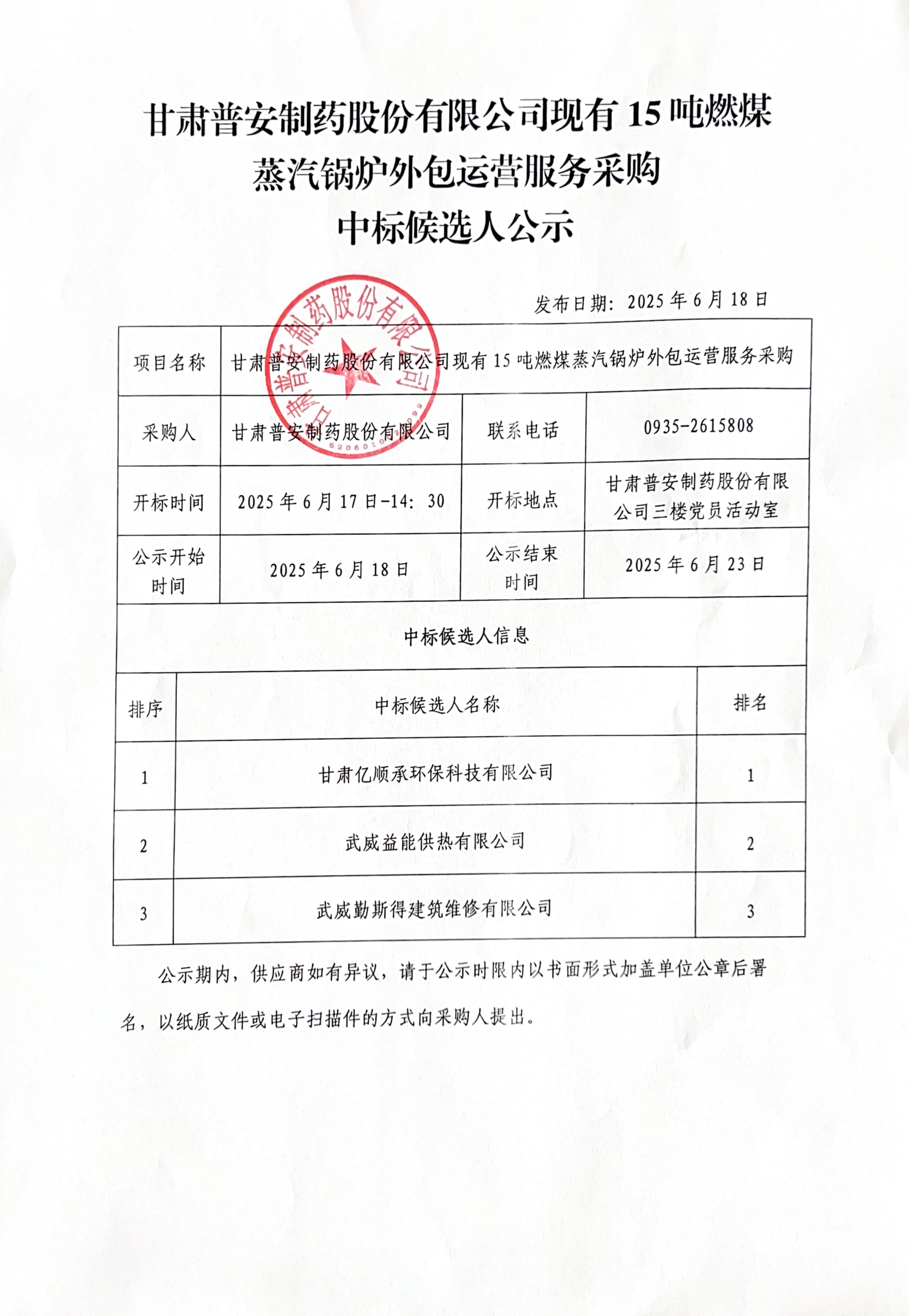 甘肅普安制藥股份有限公司現有15噸燃煤 蒸汽鍋爐外包運營服務采購中標候選人公示